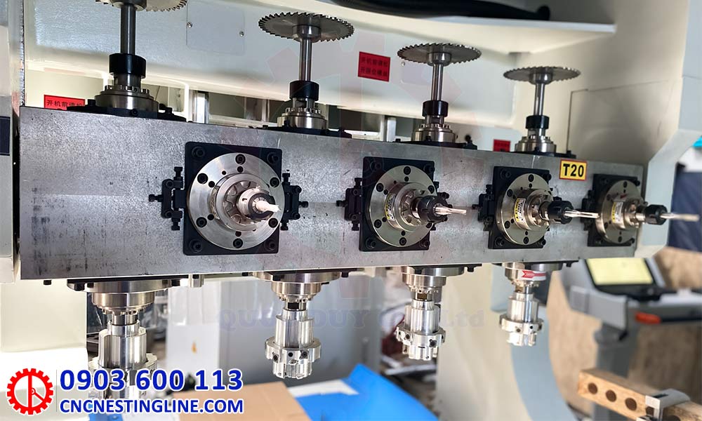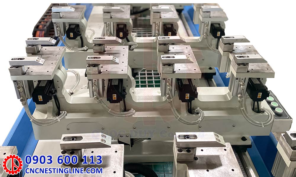 Máy cnc 4 trục 16 dao kẹp xoay 180 độ chuyên dụng cho gia công mộng âm dương 5 mặt phôi, trang bị 6 bàn kẹp servo, đảm bảo độ chính xác cao và thời gian gia công tối ưu.